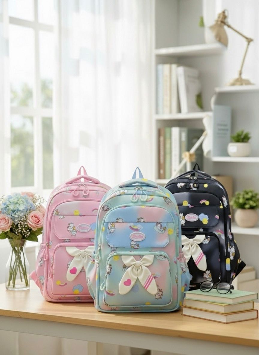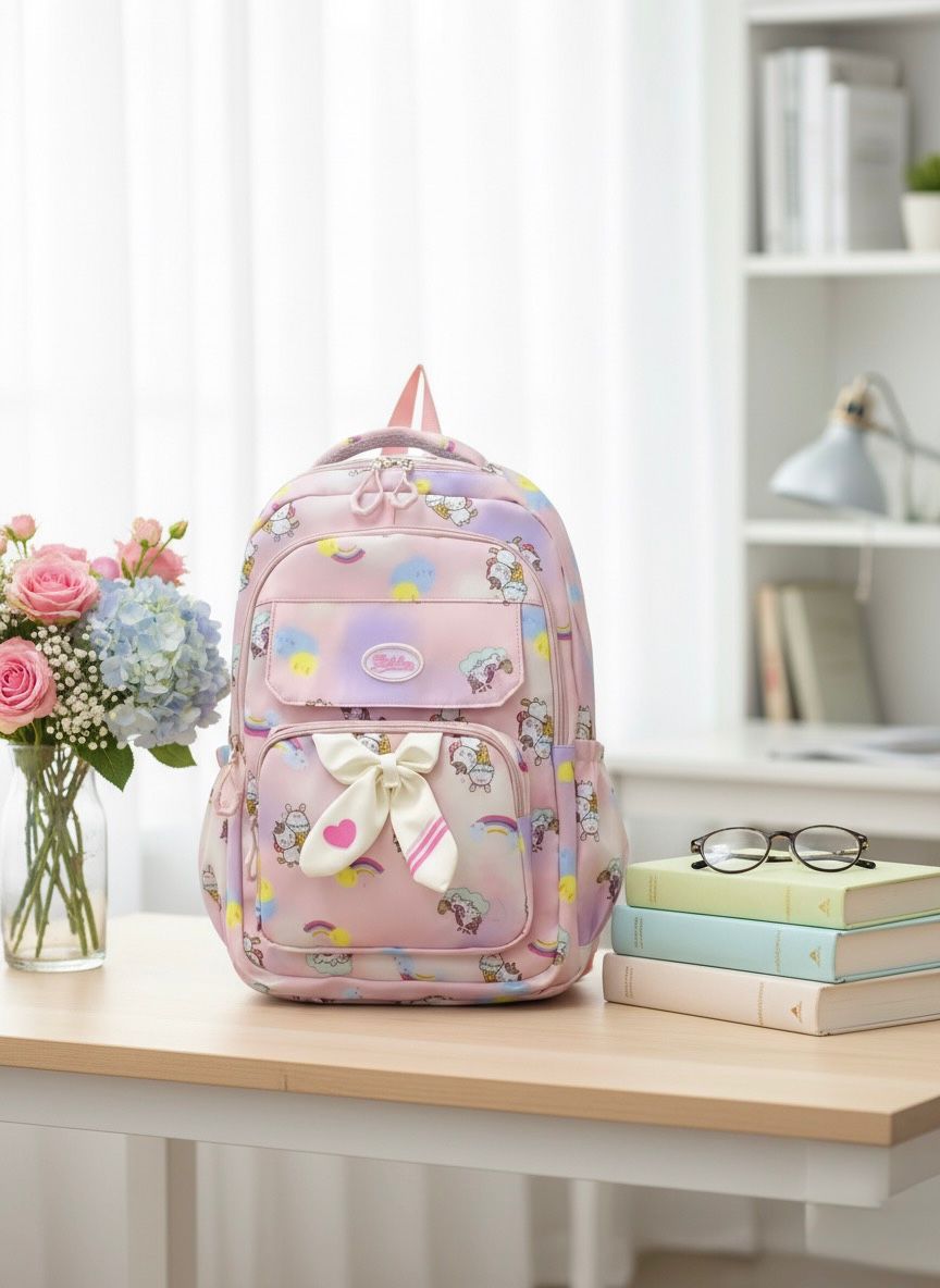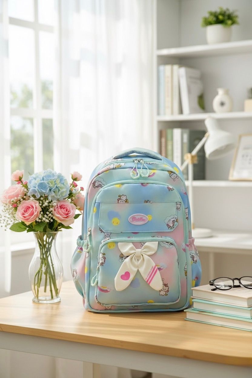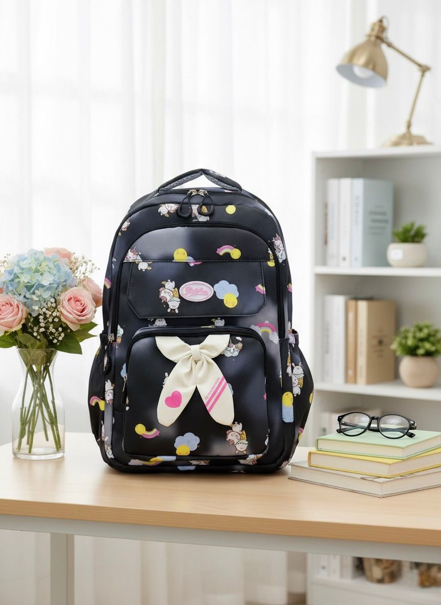 - Design: Features a stylish cartoon pattern and a prominent bow on the front pocket.
