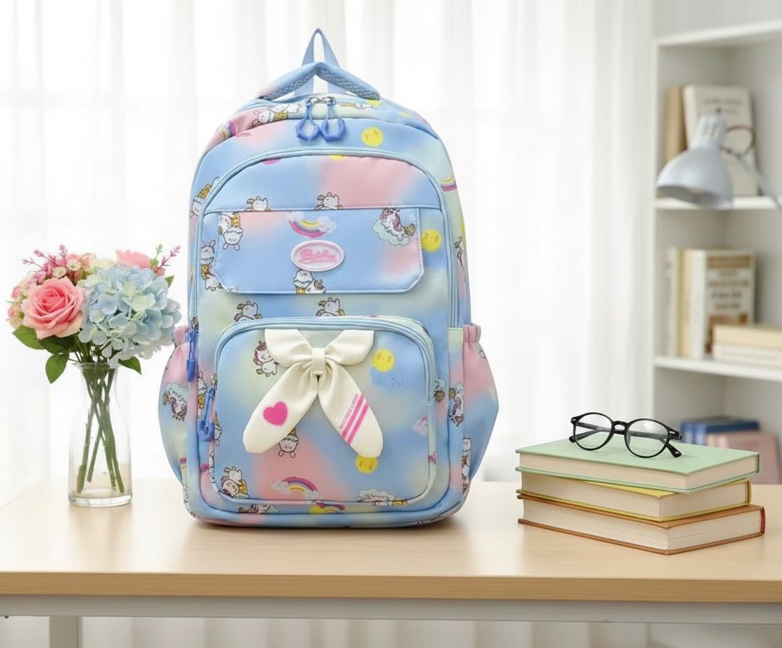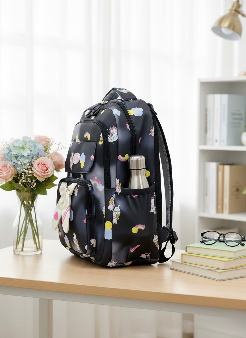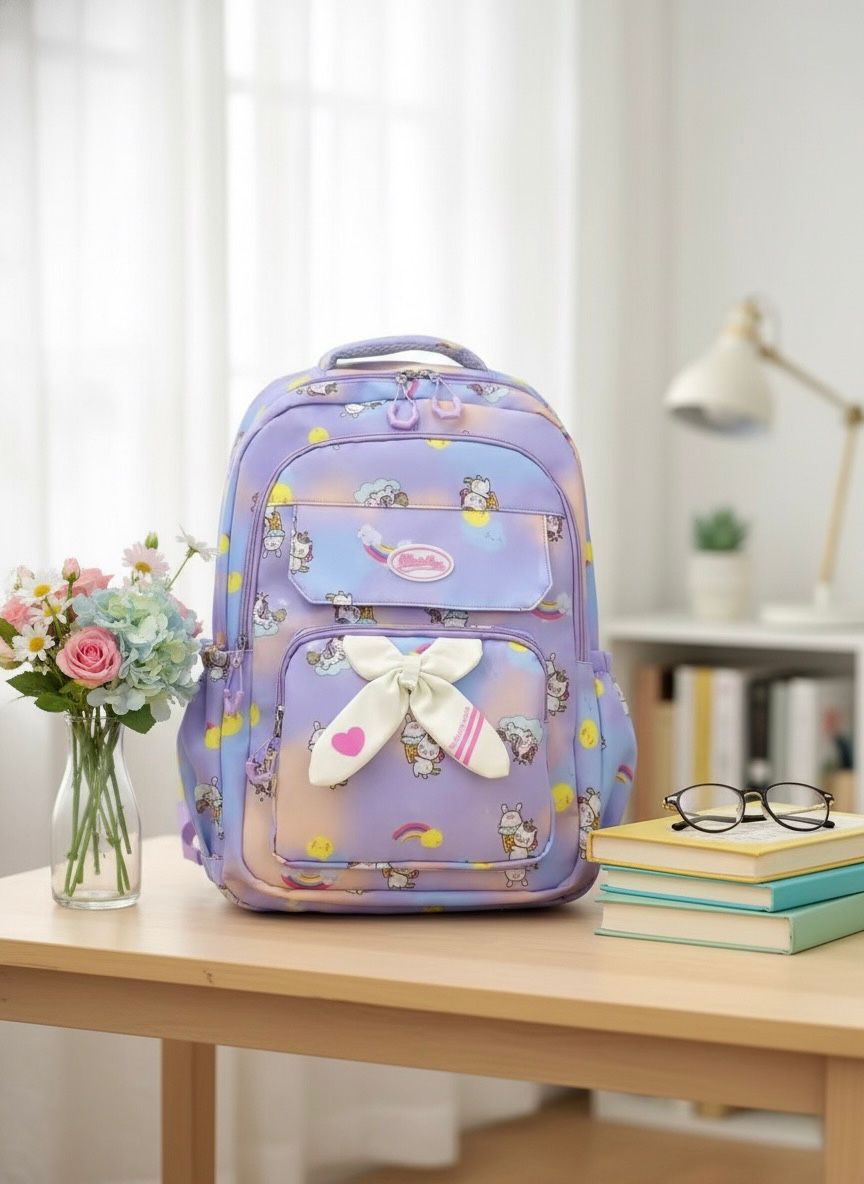 - Design: Features a stylish cartoon pattern and a prominent bow on the front pocket.
