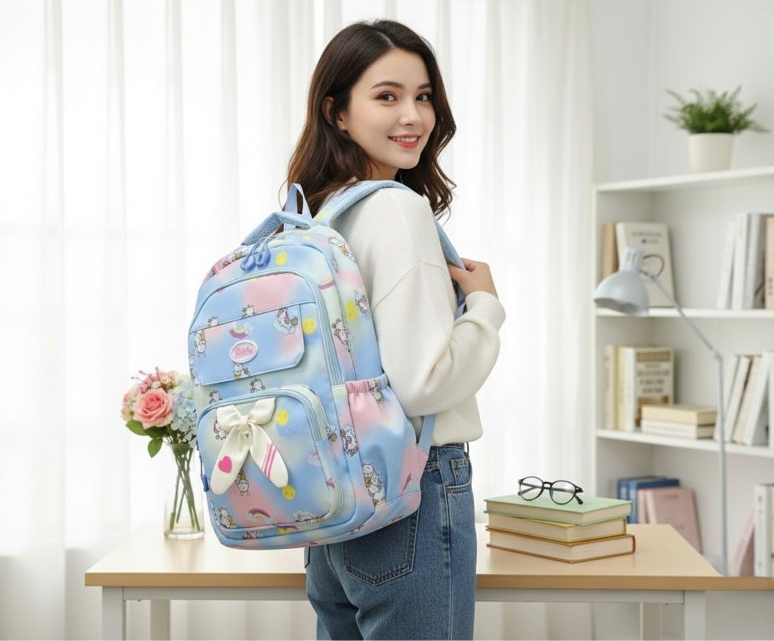 + Free ShippingThis adorable and functional backpack is designed for girls, featuring a cute cartoon print with clouds, rainbows, and animal characters. The bags come in multiple colors including pink, blue, purple, and black. Each backpack has a large front pocket adorned with a decorative bow.