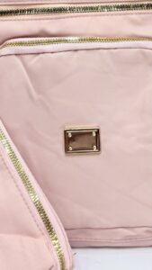 - All visible zippers and hardware, including a small rectangular plaque on the front pocket, are in a gold-tone finish, adding a touch of elegance.
