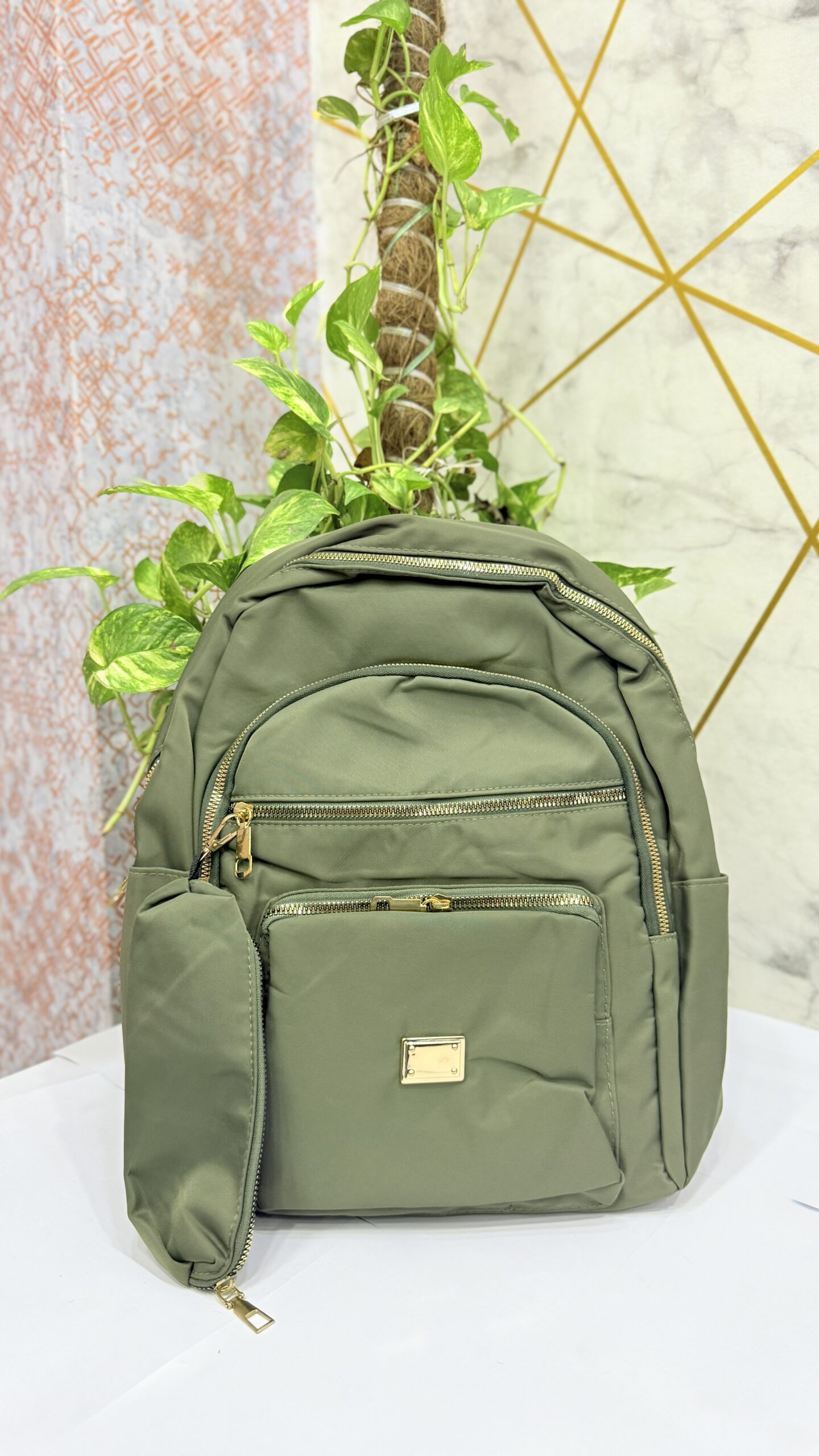 • All visible zippers and hardware, including a small rectangular plaque on the front pocket, are in a gold-tone finish, adding a touch of elegance.