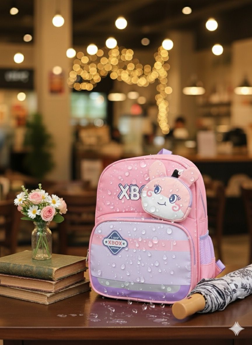 + Free ShippingThe bags are designed as school backpacks for children, with a primary large compartment and a smaller front pocket. They feature padded shoulder straps for comfort and a top handle for carrying or hanging. On one side of the bags, there is a mesh pocket suitable for holding a water bottle. All of the bags also include a small, detachable animal-themed coin purse or accessory